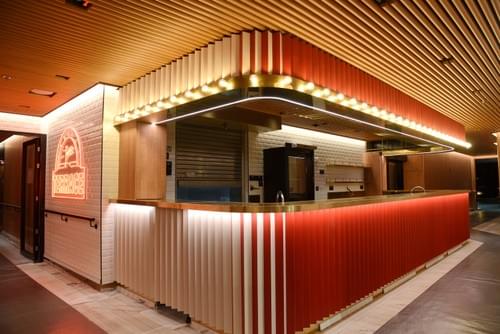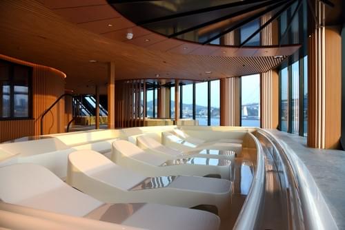 区域范围:免税店、广场咖啡馆、维京露台屋顶酒吧、儿童游乐区、可容纳400人的会议设施,以及水疗健康中心(含2间护理室、小型健身房、瑜伽室、桑拿房、休闲泳池、按摩浴缸与雪洞);同时负责日光甲板区域的照明安装与调试,总面积5600m²